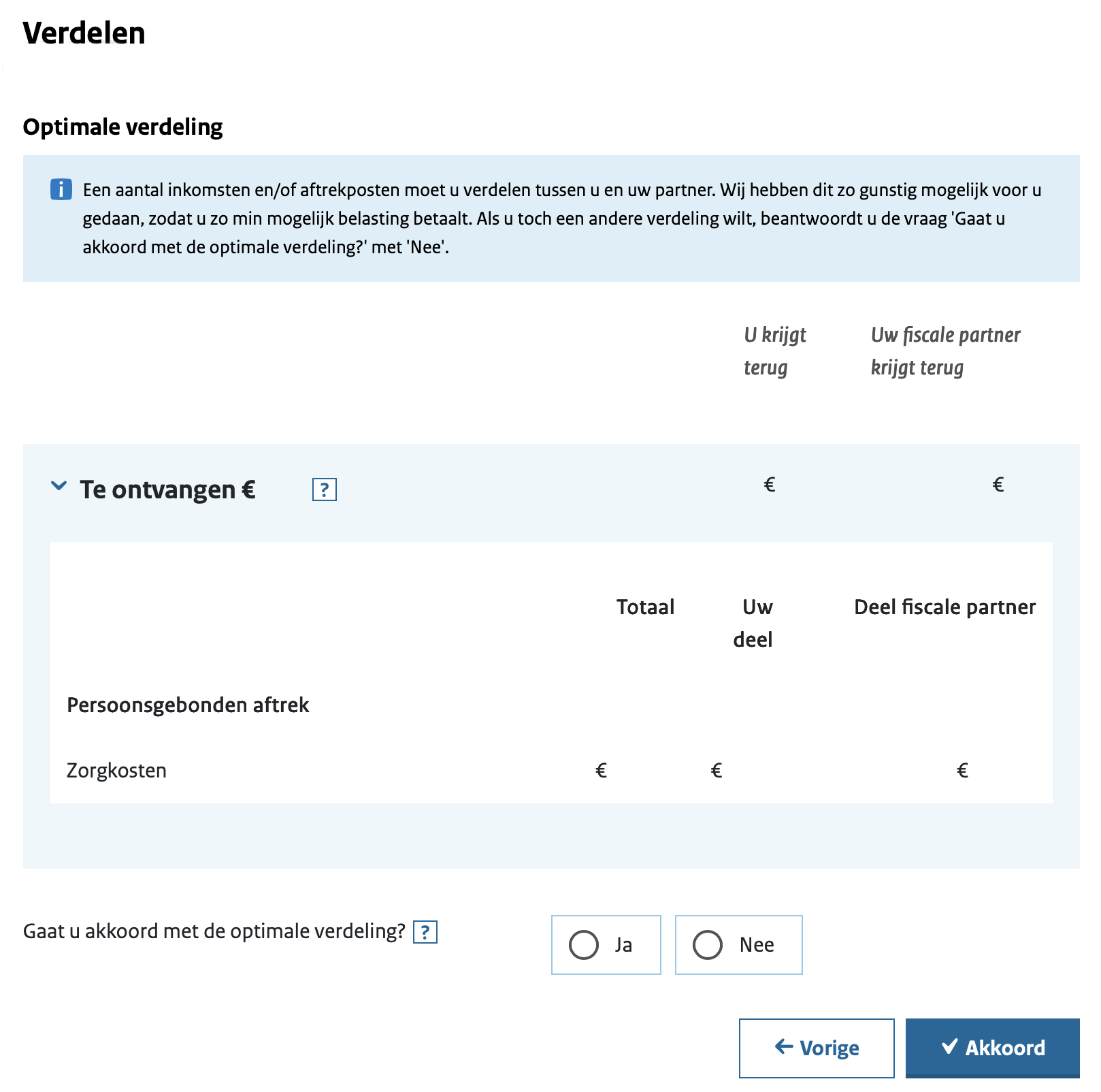 Ga in de online aangifte naar de rubriek ‘Verdelen’. Je ziet daar het totaalbedrag voor de aftrek van specifieke zorgkosten al in het lijstje staan. Je kunt dit bedrag nu verdelen over jou en je fiscale partner. De online aangifte heeft al berekend wat de meest voordelige berekening is. Maar je kunt natuurlijk altijd checken of dat klopt, door niet akkoord te gaan met de voorgestelde optimale verdeling. Doe dat voordat je onderaan het werkblad op ‘Akkoord’ klikt!
